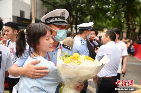6月9日,在长沙市一中考点前,一名现场执勤的交警与结束高考的女儿拥抱。当日,湖南省2022年高考结束。 中新社记者 杨华峰 摄