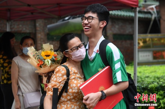 6月9日,广东省广州市,家长与考生在越秀区执信中学考场外相拥。当日,广东省2022年高考结束。 中新社记者 陈楚红 摄