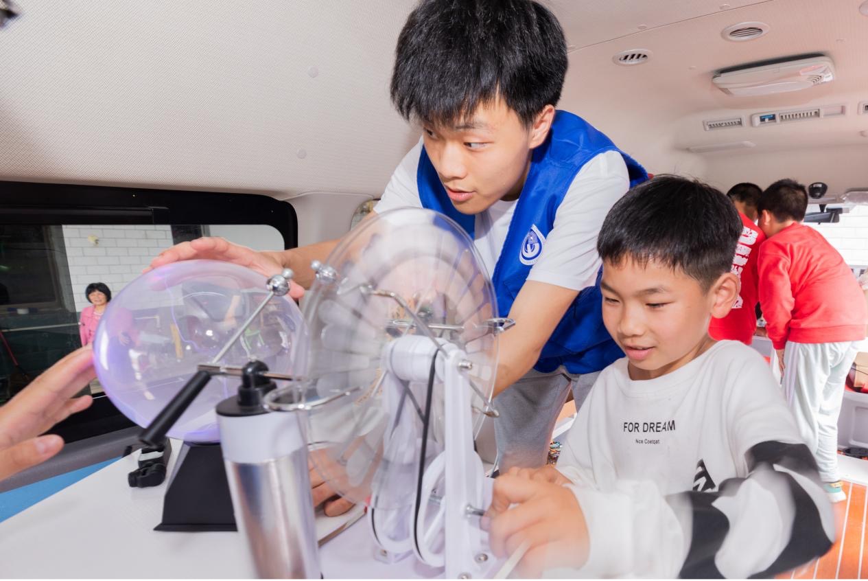 在好奇心的驱使下,小朋友们纷纷登上“移动实验城堡”,与科普实验设备近距离接触,进一步感受科学的魅力。大学生“老师”们为小朋友提供了丰富多彩的科普教学环境,还精心制作了科普教学视频供他们进行自主学习。