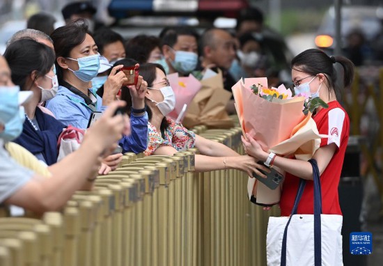 6月10日,在北京师范大学附属实验中学考点门口,考生家长为走出考点的考生送上鲜花。