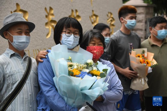 6月10日,在北京市中关村中学考点外,考生在考试结束后与家长合影留念。