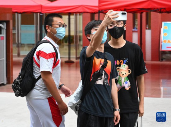 6月10日,考试结束后考生在北京市玉渊潭中学考点门口自拍。