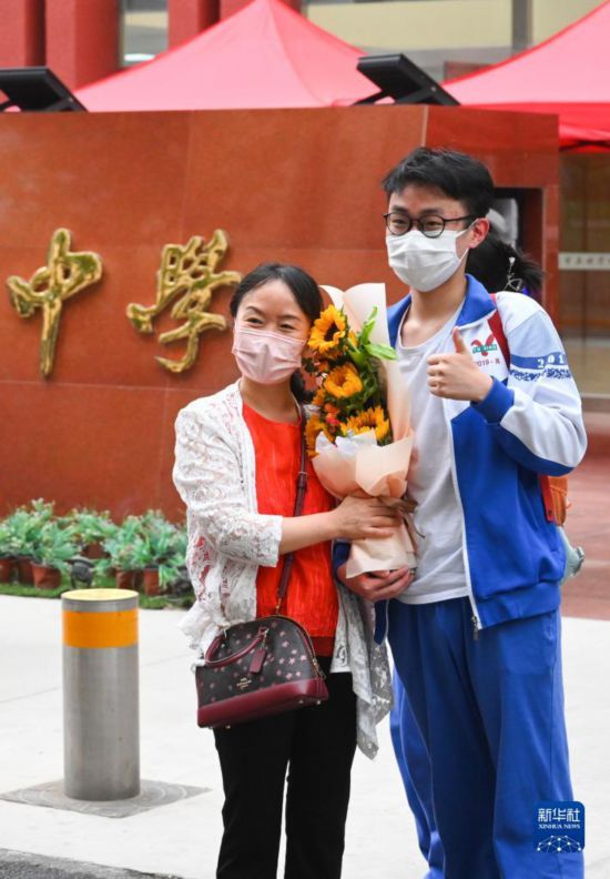 6月10日,在北京市玉渊潭中学考点门口,一名考生和家长合影。