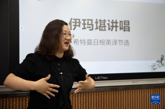 6月10日,在东北林业大学的教室中,熊辉用英语讲解赫哲族“伊玛堪”说唱。