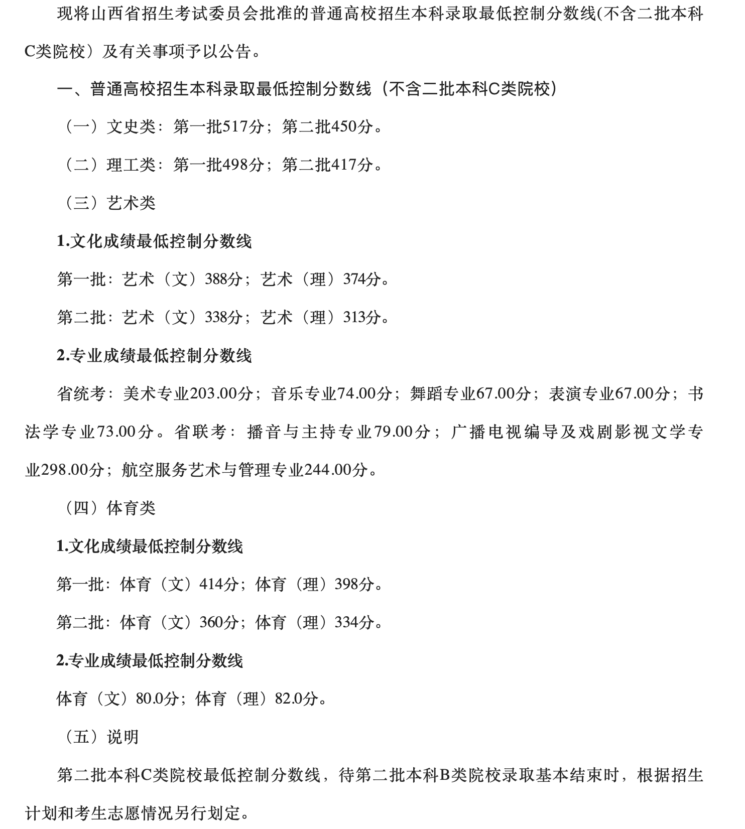 2022年山西省普通高考本科各批次录取最低控制分数线