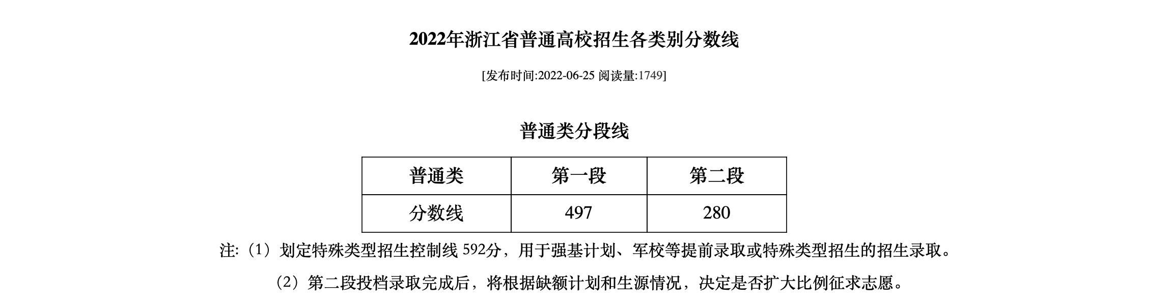 2022年浙江省普通高考本科各批次录取最低控制分数线