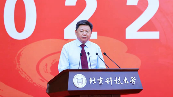 北京科技大学校长杨仁树在2022届学生毕业典礼上讲话。校方供图