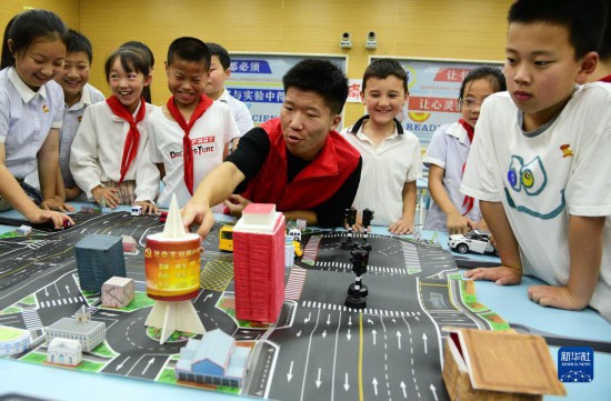 6月30日,在江苏省镇江市金山小学,江苏大学志愿者通过“模拟路况”场景为小学生演示讲解交通安全知识。