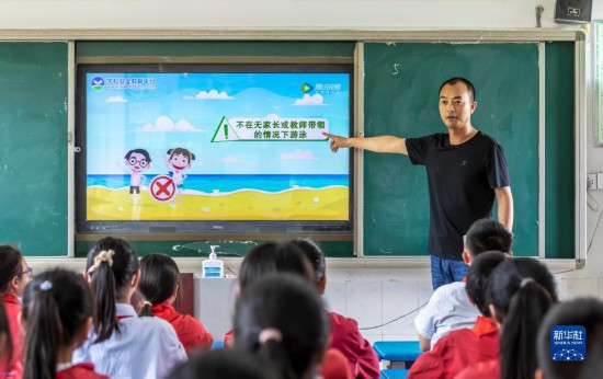 6月30日,在贵州省黔西市第十二小学开展的暑期安全教育主题班会上,老师对学生进行安全教育。
