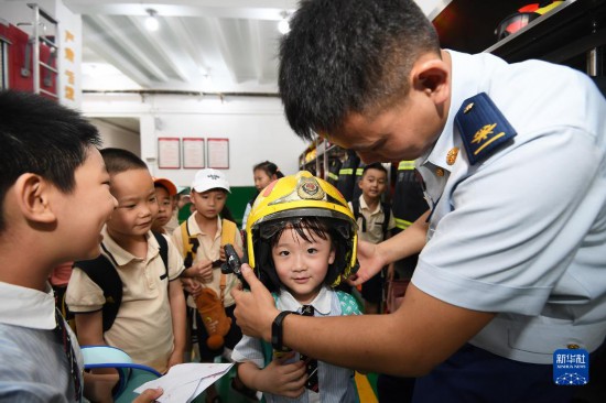 6月30日,贵州省贵阳市第十一幼儿园的小朋友在贵阳市南明区消防救援大队体验消防救援头盔。