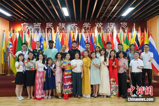 7月3日,广西南宁,广西民族大学留学生校友返校合影。中新社记者 王以照 摄