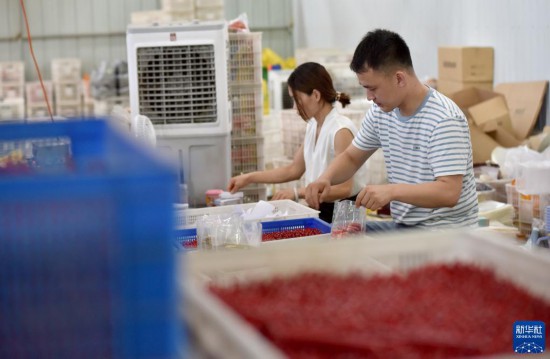 7月7日,在河北省邢台市南和区南韩村的电商孵化基地,冯亚飞(右)在仓库内分拣货物。