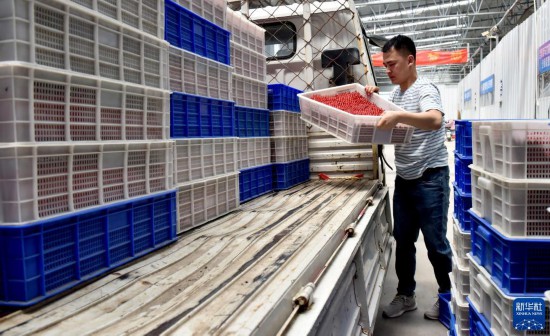 7月7日,在河北省邢台市南和区南韩村的电商孵化基地,冯亚飞在仓库内搬运货物。