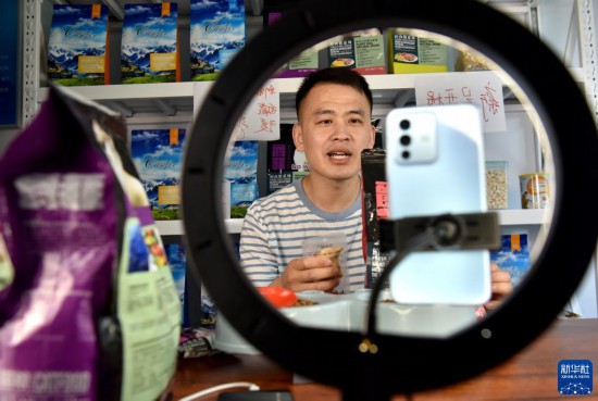 7月7日,在河北省邢台市南和区南韩村的电商孵化基地,冯亚飞在进行网络直播带货。