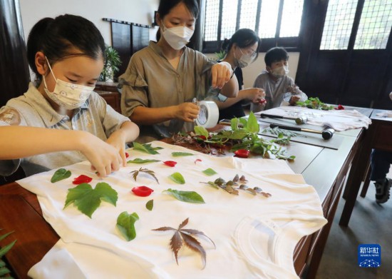 7月12日,在江苏苏州虎丘景区,家长陪同小朋友在体验植物拓染。