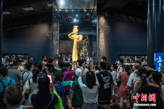 图为三星堆博物馆内的青铜大立人像吸引参观者。 刘忠俊 摄