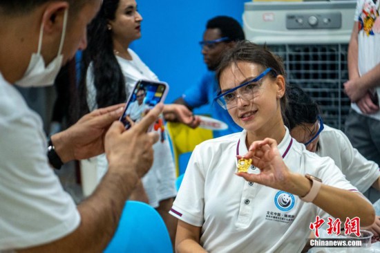 图为外籍师生在三星堆体验开盲盒,一名外籍学生展示自己“挖到的金面具”。 刘忠俊 摄