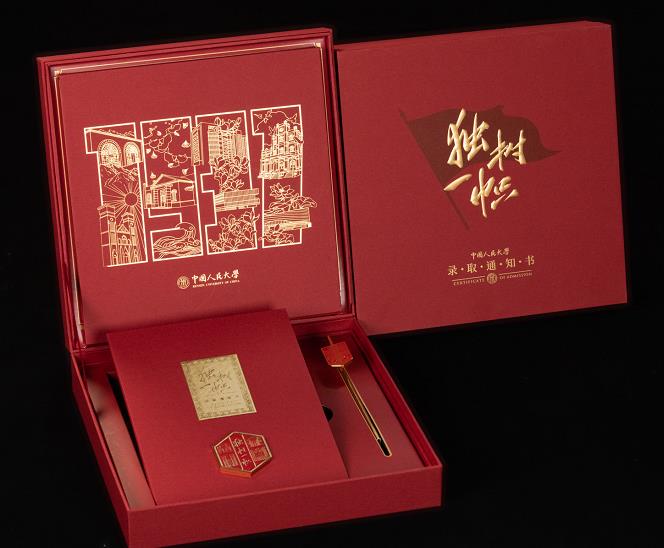 2022年,中国人民大学新版录取通知书采用函匣立体式设计,以人大红为主色调,共分上下两层。函匣轻启,一张一合,吞吐着这所以人民为名的学校跨越85载奔涌不息的万千气象,更蕴藏着一代代人大人紧跟党的步伐在中国革命、建设、改革和新时代中争做先锋分子的价值追求。