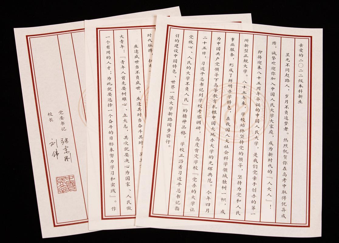 与录取通知书紧紧相依的,是张东刚书记、刘伟校长联袂致2022级同学的一封信。“生逢盛世当不负盛世,生逢其时当奋斗其时。……希望你像吴玉章老校长所说的那样,以迈入人大为崭新起点,心系国家、努力学习,不负韶华,不负时代,不负人民,在青春的赛道上奋力奔跑,书写无愧新时代荣光和使命的人生篇章!”字里行间,充盈着对青年学子的殷殷期盼之情。古朴的竖版信纸,令人似又回到党在战火中坚持创办高等教育的那段峥嵘岁月,捧读完毕,却又激荡起在新时代挥洒青春的渴望。