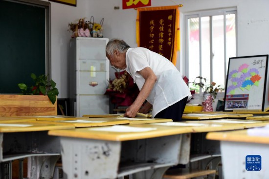 7月21日,叶连平在“留守未成年人之家”教室里为孩子们分发上课用的稿纸,并把桌椅摆放整齐。