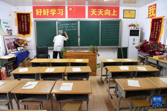 7月21日,叶连平在“留守未成年人之家”教室里为英语课准备板书。