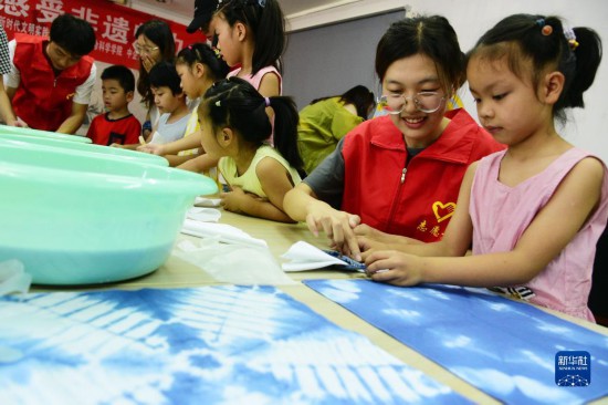 7月25日,在江苏省镇江市车站社区,江苏大学志愿者在指导小朋友学习扎染制作技艺。