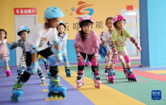 7月25日,在山东省东营市东营区文汇街道一体育运动培训学校教室内,孩子们在练习轮滑。