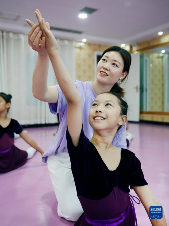 7月24日,在河南省开封市尉氏县一暑假公益培训班,老师指导孩子舞蹈基本动作。