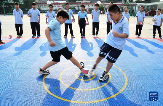 7月25日,河南省济源市济水东街学校的学生在练习踢足螺。