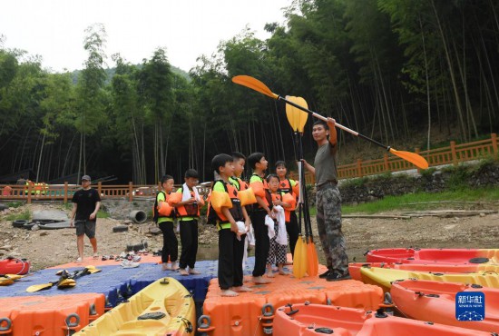 8月1日,小学生在位于绍兴市富盛镇的水上运动基地参加皮划艇拓展活动。