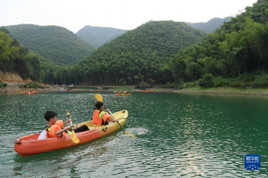 8月1日,小学生在位于绍兴市富盛镇的水上运动基地参加皮划艇拓展活动。