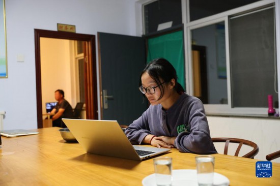7月25日,在河北省承德市隆化县张三营镇东风村,宫希希(右)在驻地与同事进行视频会议。