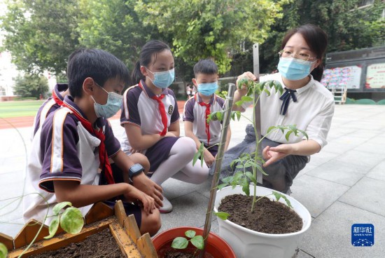 8月3日,在河北省石家庄市长安东路小学,老师(右一)为学生们测量太空种子植株。