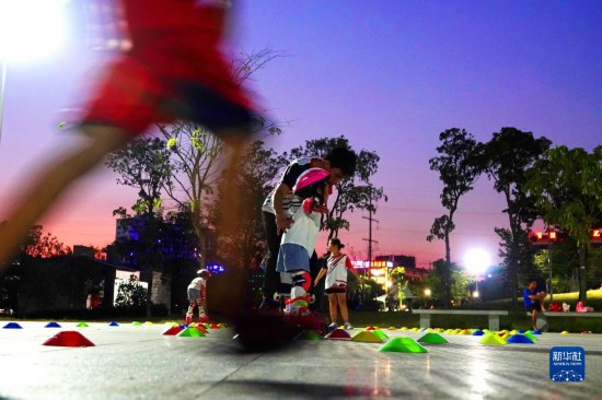 8月2日,在广西南宁市明月湖湿地公园,孩子们在教练的指导下进行轮滑训练。