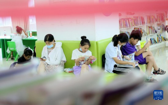 8月3日,在河南省洛阳市汝阳县图书馆少儿阅读室,学生们在阅读书籍。