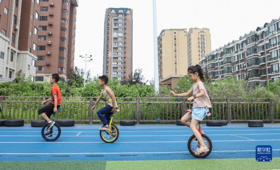 8月4日,在辽宁省沈阳市浑南区第九小学,参加暑期托管班的学生练习独轮车。