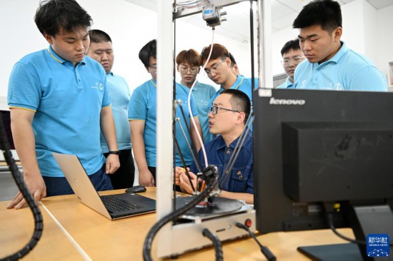 刘世雄(中)在天津机电职业技术学院的教室内给学生布置任务(8月8日摄)。新华社记者 李然 摄