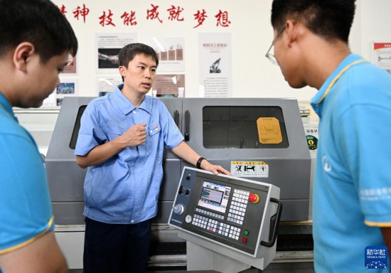 许超(中)在天津机电职业技术学院的教室内给学生讲解设备操作要领(8月8日摄)。新华社记者 李然 摄