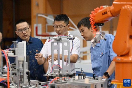 在天津机电职业技术学院,王兴东(中)、许超(右)和刘世雄在查看首届世界职业院校技能大赛比赛设备(8月8日摄)。