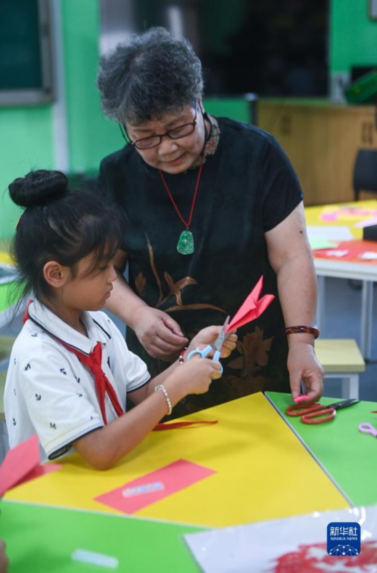 8月10日,湖州市吴兴实验小学的学生在“博学课堂”上学习剪纸。 新华社记者 徐昱 摄