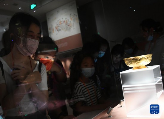 8月11日,游客在陕西历史博物馆何家村窖藏出土文物展上参观鸳鸯莲瓣纹金碗。
