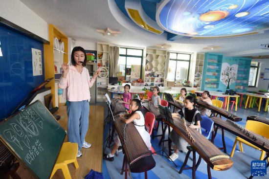 8月10日,在合肥市凤凰城小学暑期托管班里,学生在老师指导下学习古筝。