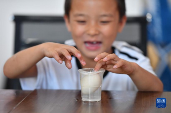 8月17日,在湘潭市雨湖区窑湾街道唐兴寺社区,小朋友在做“浮起来的鸡蛋” 科学小实验。