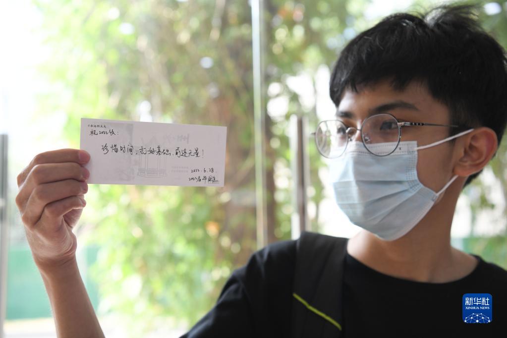 8月21日,中国科学技术大学2022级本科新生陈君旭展示写有学长学姐祝福的明信片。新华社记者 张端 摄