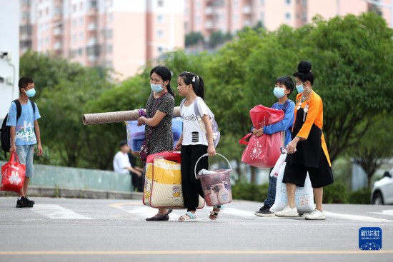 8月22日,在贵州省黔东南苗族侗族自治州丹寨县第二中学,家长陪伴初一年级新生前往报到处报名。