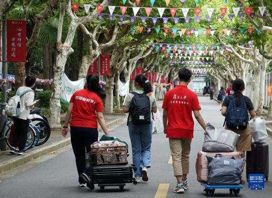 8月28日,复旦大学迎新志愿者帮助新生运送行李。