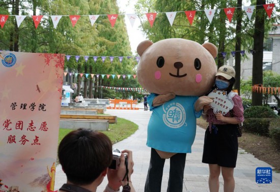 8月28日,复旦大学管理学院新生与学院的吉祥物玩偶合影。