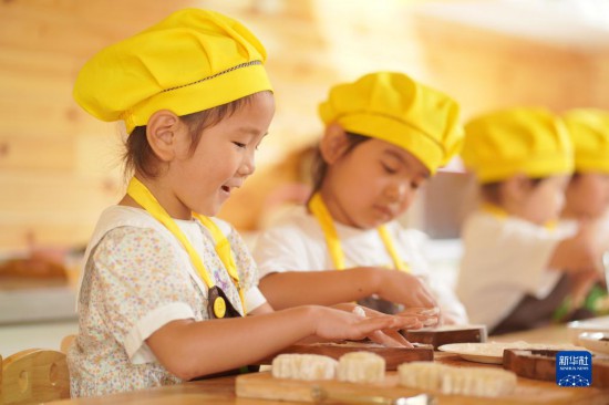 9月8日,河北省邢台市内丘县第三幼儿园的小朋友在制作月饼。