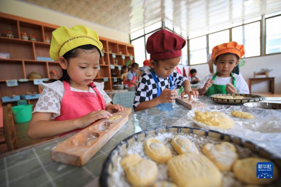 9月8日,贵州省黔东南苗族侗族自治州从江县刚边壮族乡中心幼儿园的小朋友在学习制作月饼。