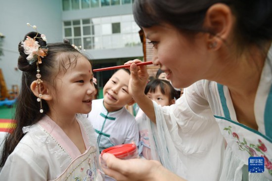 9月8日,江苏省南京市建邺区金地名京幼儿园的老师为小朋友点朱砂。